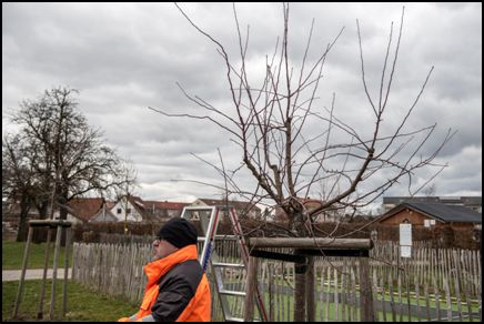 Beim Rückschnitt eines mehr als 15-jährigen Baumes, wurde nur mit der Säge gearbeitet. Es wurde nur altes Fruchtholz entfernt. Das sog. “Ableiten”, das Weiterführen eines Astes an einer Astgabel in die “richtige Richtung” wurde nicht empfohlen. Das Motto lautet: “Ganz raus – oder belassen”.