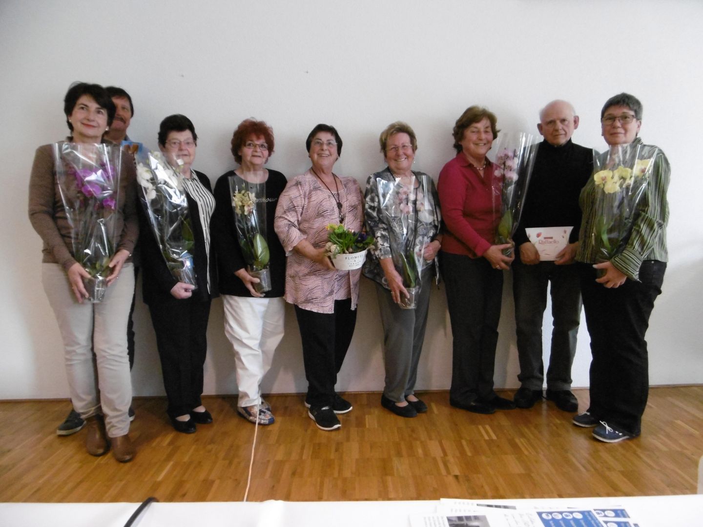 Frau Heide Popa wurde geehrt als Mädchen für alles, von Putzleistungen bis zur Textverarbeitung am Computer bearbeitet sie alles, was aktuell anfällt“. Maria Bubeck-Lippold wurde für zahlreiche Führungen im Heubacher historischen Klassenzimmer und im Gmünder Schulmuseum geehrt. Elsbeth Steeb, Organisatorin und Ideengeberin bei der Gestaltung des 4. Zimmers im Schulmuseum zum Thema „Lob und Tadel in der Schule früher und heute“ würdigte Gerda Fetzer die herausragende Leistung, dessen Fertigstellung nahe bevorsteht. Gerda Austel dankte sie für ihre intensive Mitarbeit im Büro, „22 Jahre war sie unser Mitglied in vielen Funktionen und Tätigkeiten.“ Den Pressereferenten Karl Koschorreck lobte sie für seine Zeitungsartikel und viele Anregungen. Die Leistungen von Martin Trunk, dem Schatzmeister, stellte sie besonders heraus, Gerda Austel stimmte ein: „er ist ein Glücksfall für unseren Verein.“ Herbert Volkert dankte Gerda Fetzer für sein Engagement im Medienzentrum auch von Göppingen, wo er ausgediente Schulfilme vor dem Verschreddern rettet und dem Schulmuseums Fundus zuführt: „Viele werden während der Remstal-Gartenschau auch jeden Donnerstagnachmittag im Schulmuseum von ihm gezeigt werden“ Schließlich wurde Gerda Fetzer selbst von den zuvor Geehrten für ihre Mitarbeit fast rund um die Uhr und ihr unermüdliches Anschubsen von Ideen bei den Mitarbeitern“ gewürdigt. Sie erhielt dafür eine Pflanzschale voller Frühlingsblumen, während die 6 anderen Damen jeweils eine Orchidee, die drei Herren etwas Süßes zum Lohn bekamen.