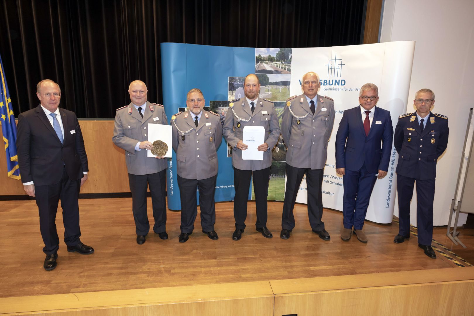 2021 sicherte er seine Unterstützung zu. Der Landesvorsitzende des Volksbunds, Guido Wolf, unterstrich die Dankbarkeit des Volksbundes gegenüber den ehrenamtlichen Helfern in Uniform, wie auch gegenüber dem Innenministerium. In seiner Rede berichtete er über aktuelle Aufgaben des Volksbundes. Bei einem Besuch an deutschen und französischen Kriegsgräbern vor einigen Wochen in Nordfrankreich, sei ihm einmal mehr die Wirkung dieser Lernorte der Geschichte bewusst geworden. Stellvertretend für alle Kameradinnen und Kameraden aus Schwäbisch Gmünd und Waldhausen nahmen Oberstleutnant der Reserve Andreas Trummer, Hauptfeldwebel der Reserve Thomas Maier, Oberstabsgefreiter der Reserve Sven Neumann sowie Obergefreiter der Reserve Olaf Jacobsen die Urkunden entgegen. Auch in diesem Jahr wollen die beiden Kameradschaften wieder gemeinsam die Sammlung an Dreifaltigkeits– und Leonhardsfriedhof an Allerheiligen in Schwäbisch Gmünd durchführen.