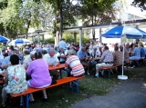 Ein Hoch bescherte nach der längeren Schlechtwetterfase bestes Sonnenwetter und jedes schattige Plätzchen wurde gesucht, ob unter der Überdachung, oder unter den zahlreichen Sonnenschirmen, selbst jeder Schatten der Bäume wurde genutzt. Der Vorsitzende der ZFLS-Rentnergemeinschaft Franz Reichenauer konnte nahezu 400 Rentnerinnen und Rentner mit ihren Angehörigen und Freunden begrüßen. Ganz besonders begrüßen konnte er den für alle ZFLS-Werke weltweit zuständigen Personalchef Herrn Hermann Sauter, der das ersten Mal zum Gartenfest der ZFLS-Rentnerinnen und –Rentner kommen konnte. Weiter begrüßte er die Personalchefin von ZFLS-Schwäbisch Gmünd Frau Barbara Krieger, Personalreferent Werner Hartmann, Herrn Helmut Schneider von der Personalabteilung, der auch für die Rentner zuständig ist, gekommen waren. Vom Betriebsrat kam Reinhardt Nessel und der Vorsitzende Harald Brenner mit Frau ist sogar aus dem Urlaub gekommen und aus Bietigheim eine Abordnung der dortigen Rentnergemeinschaft. Nicht zuletzt begrüßte er Bürgermeister Seyfried, der es sich nicht nehmen ließ, die ZFLS– Rentnergemeinschaft zu besuchen. Reichenauer bedanke sich beim Mutlanger Bürgermeister für den Platz der von ihm jedes Jahr zur Verfügung gestellt wird.
