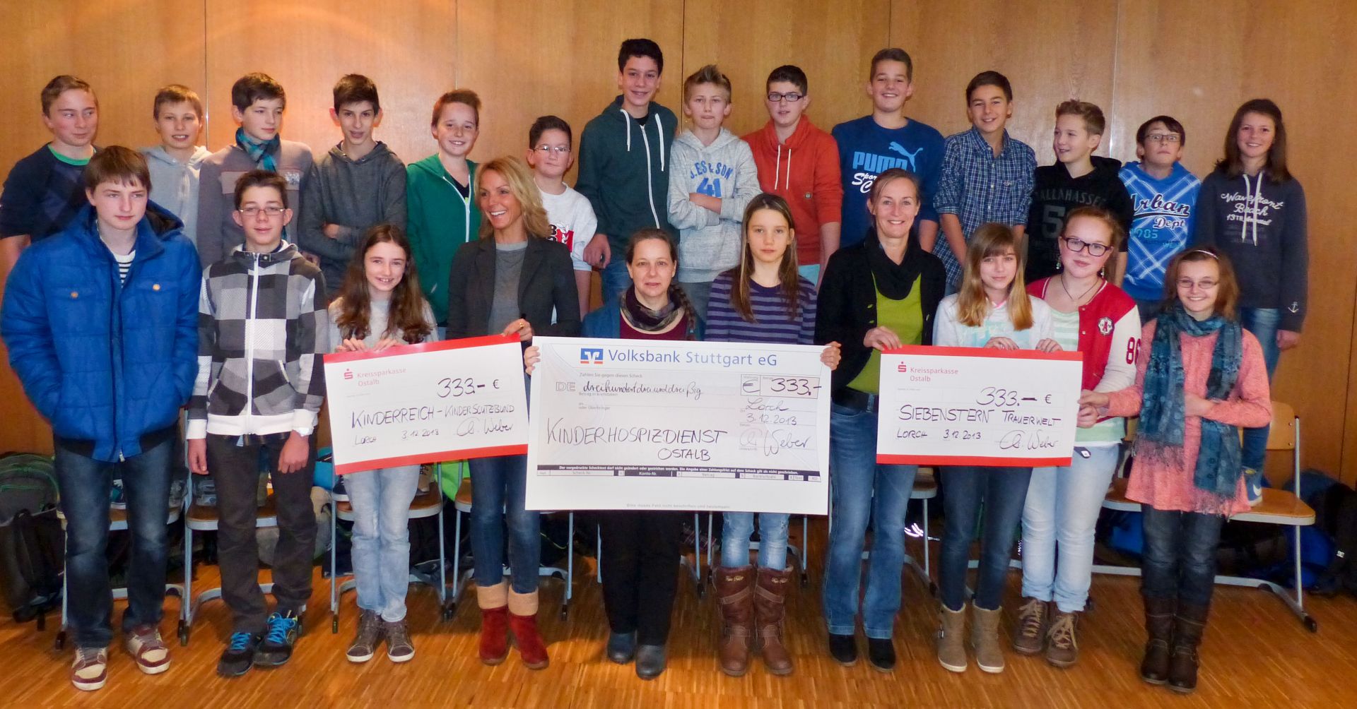 333 € erhalten folgende Projekte:Der Verein Siebenstern Trauerwelt, der sich um Kinder und Jugendliche bemüht, die einen nahestehenden Menschen durch Tod verloren haben. Mitglieder des Vereins begleiten Kinder in ihrem Trauerprozess. Die Vorsitzende Uta West freute sich über den Scheck besonders, da trauernde Kinder still und unbemerkt allein mit ihrer Trauer leben müssen. Karin Feig, Vertreterin des Projektes Kinderreich des Kinderschutzbundes Rems-Murr freute sich ebenfalls über die Unterstützung. Laut dem Bericht „Kinderarmut in Deutschland“ vom Deutschen Kinderschutzbund leben