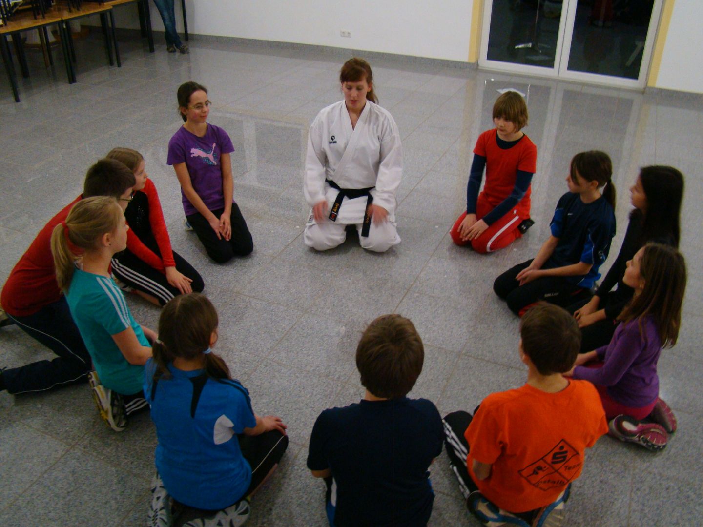 14 Jahren waren gekommen, um von Franziska Stierl, Schwarzgurtträgerin im Karate, in drei Gruppen unterteilt, das richtige Verhalten zu lernen und ihr Selbstvertrauen zu stärken. Für alle Kinder galt es, ein lautes, deutliches „nein“ gegenüber Belästigern auszusprechen, gegebenenfalls auch zu schreien. Während bei den Kleineren eine Abwehrhaltung und das Neinsagen geübt wurden und wie sie sich aus einem Festhaltegriff wieder befreien, um schnell wegzulaufen, stand bei den großen Kindern im Vordergrund, sich gegen Pöbeleien auf dem Schulhof zur Wehr zu setzen. Jeder dieser Übungen voraus ging eine traditionelle Karate-Begrüßung im Kreis sowie ein Aufwärmtraining mit mehreren Stationen. Ein theoretischer Teil mit anschließender praktischer Umsetzung schlossen sich an, ehe es nach einer Stunde hieß, das Training nach Karate-Art auch wieder zu beschließen. Begeistert und mit gestärktem Selbstvertrauen nahmen die Kinder Abschied.