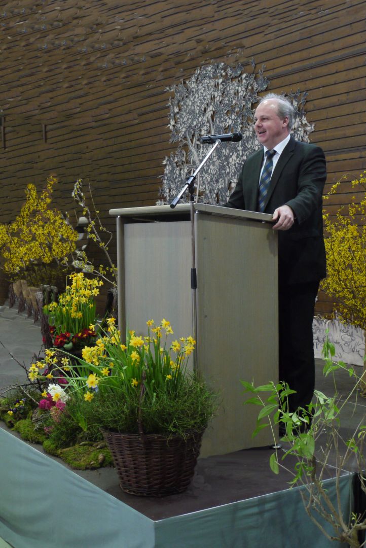 Stolz dürfet wir en de Gmoida sei‘ auf onsre rührige Obst– und Gardabauverei‘, schaffet, helfet, wirket mit, dass onsre Gmoida bleibet zukunftsfit, Stauda, Baim ond Blumaschmuck, mit de‘ Obstler goht a‘ Stuck, für’s Obscht händ’se grad so a‘ glücklich’s Händle, brenget au‘ en leckra Flada en’s Pfännle, wenn dann d’r Moscht für Körper, Geist ond Seel‘ no‘ schmeckt, isch d’r Frieda‘ en de Familia perfekt. Ihr älle seid d’r greene Dauma‘ en de Gmoida ond Städt‘, es dät viel Kultur fehla‘, wenn Eich a‘ Schuldes net hätt‘, gebet de‘ Ortsbilder stets a‘ freindlich’s Gesicht, onsre Obschtler em Ländle send oifach a‘ Gedicht, vielleicht hat’s au‘ d’r Kretschmann in Stuagard scho‘ kapiert, onsre Obst– ond Gardabauverei‘ wisset seit 150 Johr, wia greena Politik funktioniert, au‘ ohne Gutachda ond Wissaschaftler wisset Ihr ganz genau, was de‘ Pflanza guat duat, denn Ihr seid oifach schlau, Obschtler send Macher ond Gestalter onserer Kulturlandschaft, gemeinsam mit de‘ Landfraua, Brenner, Imker ond Baura seid Ihr a‘ klasse Mannschaft, sorget stets en onsre Gmoida für a‘ greena Schau, ond des net bloß zu Zeida d’r Landesgardaschau, dafür an Eich mei‘ ganz großer Dank, für ons Gmoida seid Ihr a‘ ganz starka‘ Bank, Ihr seid Heimatschützer mit Verstand, des sagt mir d’r g’sonde Menscha’verstand, es griaßt Eich diesmol aus Wißlenga ganz nett, Schuldes Michael Rembold aus Waldstett‘.