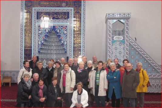 44-er Altersgenossinnen und –genossen bei der Führung durch die Räumlichkeiten der neuen Moschee. Der wunderschöne, mit farbigen Fliesen ausgestattete Gebetsraum ist der Mittelpunkt. Hier ruft sechs Mal am Tag der Muezzin zum Gebet. Die