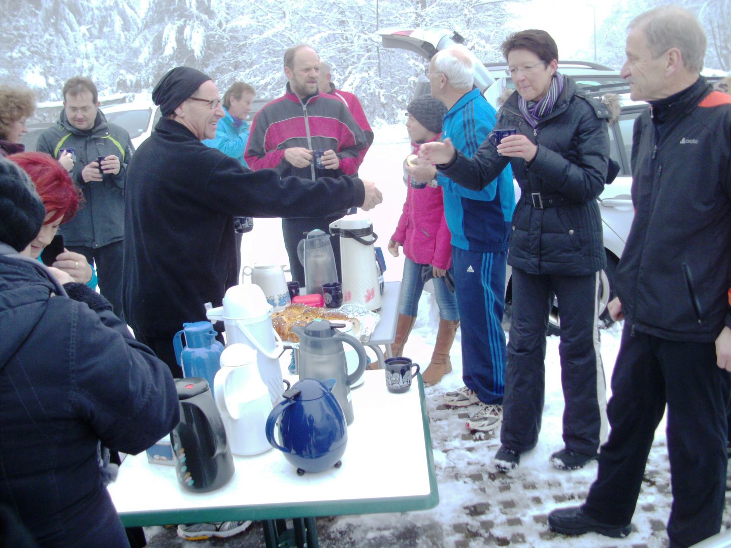 5 Km die Sechser und zum guten Schluß die Walking-Gruppe. Nach genau einer Stunde sind alle wieder zurück. Fleißige Hände hatten schon einen Tisch mit Tee, Glühwein und Berlinern gedeckt, das alles von Lauftreffbetreuern und vom Verein gesponsert wurde.